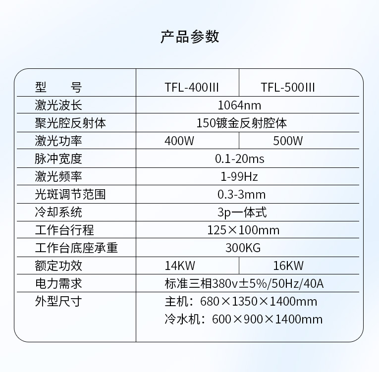 TFL-400Ⅲ型模具激光焊機是通發(fā)激光公司自主研發(fā)的一款大功率激光焊接機,采用通發(fā)自主研發(fā)的二代精密雙燈電源為燈泵浦驅動電源,配置觸摸屏,操作更方便。主機具備激光頭手搖升降與工作臺按鈕電動升降實現(xiàn)焊接不同厚度模具的激光焊加工。本款機型更適用于各類大功率、大面積激光修補的模具。由于激光功率大,同時可激光焊接鈹銅模具,鋁材模具或鋁材零件。在大面積激光修補模具時,可以使用更粗的焊絲,激光焊接效率大幅提升。
